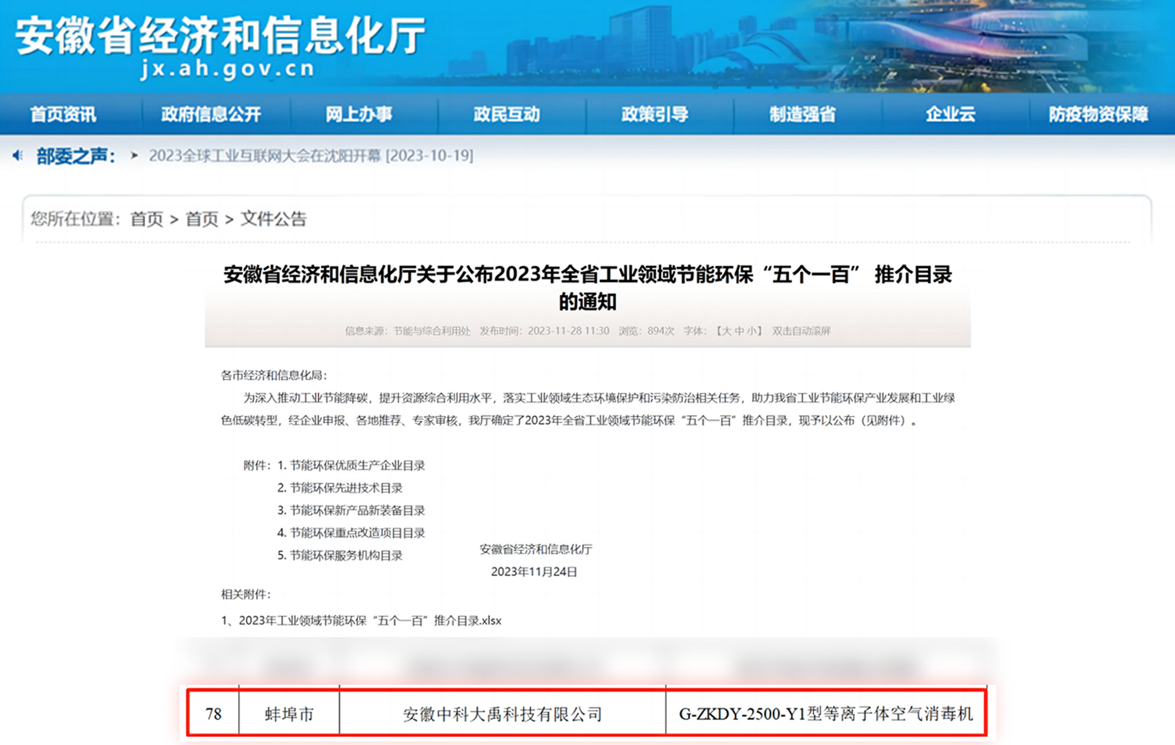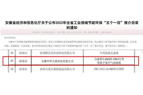 入選2023年全省工業(yè)領(lǐng)域節(jié)能環(huán)?!拔鍌€一百”推介目錄(節(jié)能環(huán)保新產(chǎn)品新裝備:G-ZKDY-2500-Y1型等離子體空氣消毒機(jī))